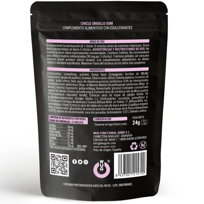 WUG Orgullo se consume diez minutos antes de mantener relaciones de pareja. Para personas con un peso superior a 80 Kg tomar dos chicles para alcanzar el efecto deseado.